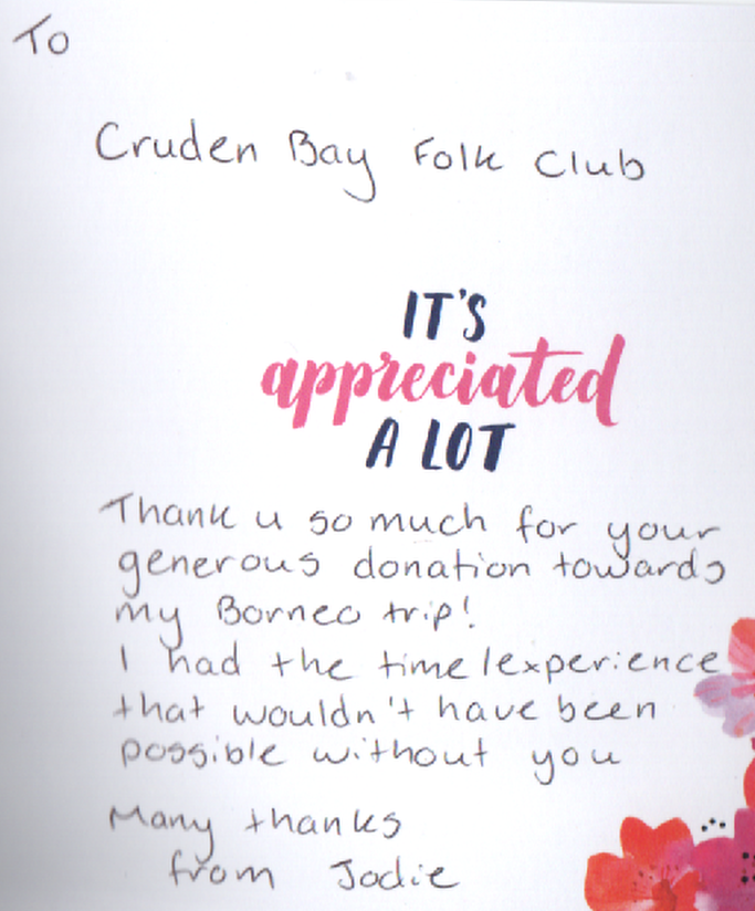 Cruden Bay was delighted to support local student Jodi Morris with a donation of £200 towards her recent school expedition to Borneo. Jodi, a 6th year pupil at Peterhead Academy, has lived in Cruden Bay all her life and is a wonderful example of the ambition and enthusiasm shown by young people in our community.
